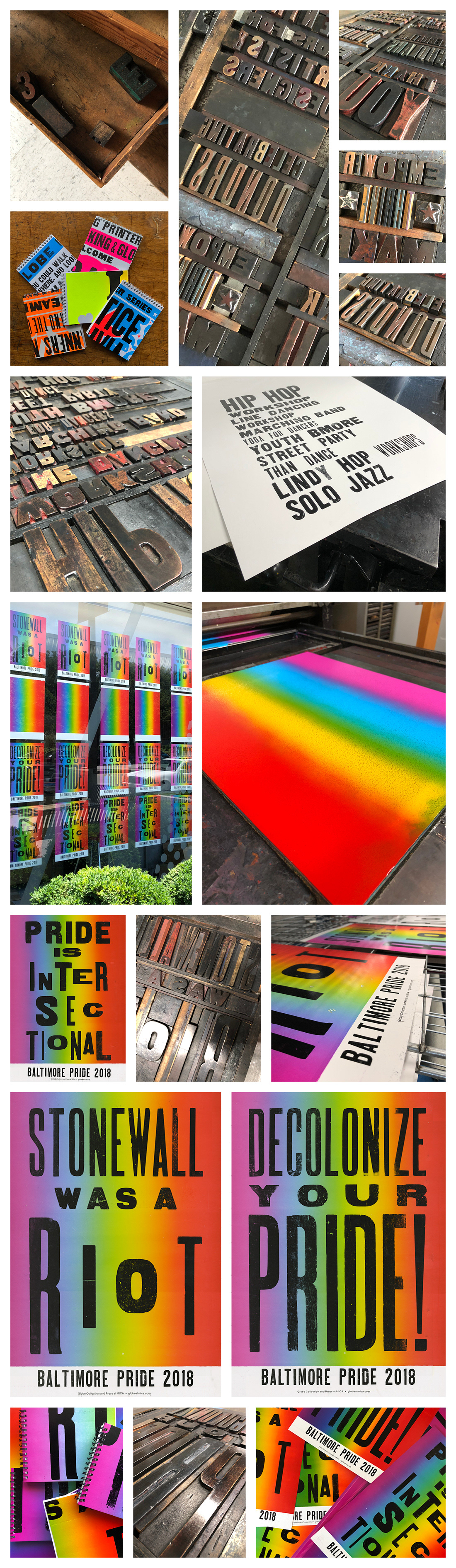 A variety of projects I worked on during my internship with Globe Collection & Press at MICA, including spiral bound notebooks, built forms for different projects, and a collaboration on a series of Baltimore Pride 2018 posters with Globe manager, Allison Fisher, and co-interns, Rachel Dunn and Lauren Jackson.